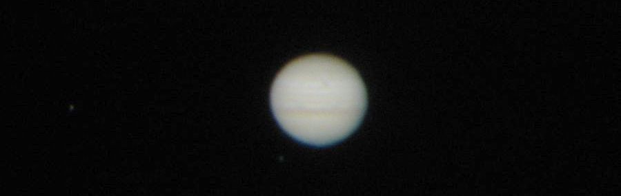 Jupiter au T560mm à l'apn avec Callisto dessous (au nord) et Io à gauche.La vision aux instruments était bien meilleure, que cette image, avec une foule de détails et de nombreuses bandes et zones.