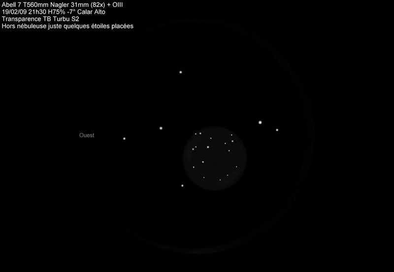 Il ou elle donc , occupe 1/3 du champs de 62° du nagler de 31mm, une étoile brillante se trouve à gauche une autre en dessous c'est très beau , il y a deux zones sombres qui apparaissent , à 161X le champs est rempli d'étoiles qui sont homogènes seules quelques unes sortent du lot, l, plus précisément trois taches sombres apparaissent , un au centre presque l'autre en dessous à gauche et un intermédiaire , une barre sombre est à la perpendiculaire de cet alignement arc de cercle vers le haut or à 5h48 elle est basse sur l'horizon la turbu reste faible le haut de ces deux zone est le centre de l'amas.