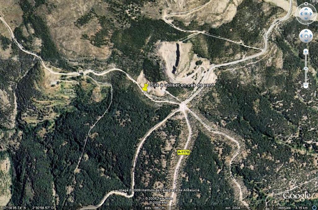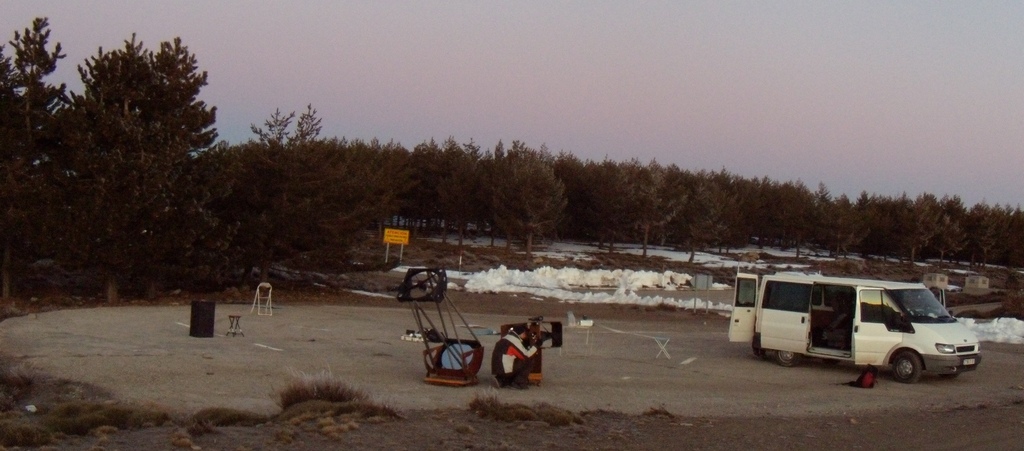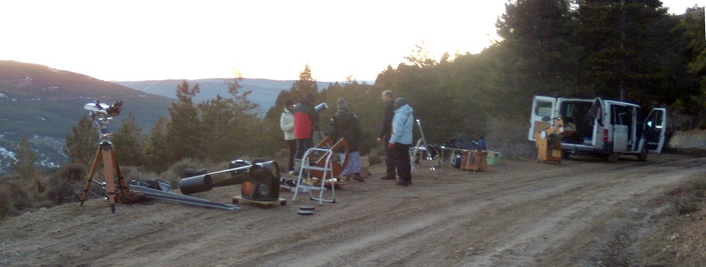 installés en fin d'après midi près d'une carrière désaffectée, (à 4km avant l'observatoire 37°14'37.57"N , 2°31'1.58"O 1850m d'altitude au nord de l'observatoire bien visible plein sud à 1km environs, ) car il y avait trop de vent à l'observatoire, même s'il était sensé diminuer durant la nuit .