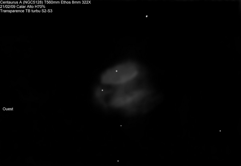 *l'oeil de chat à 580X : * centrale une zone sombre autour une spirale vers l'ouest en dessous une autre vers l'est au dessus. au centre des zones hétérogènes
