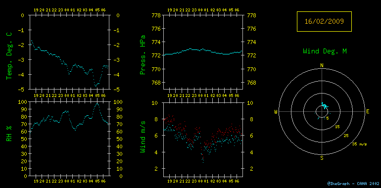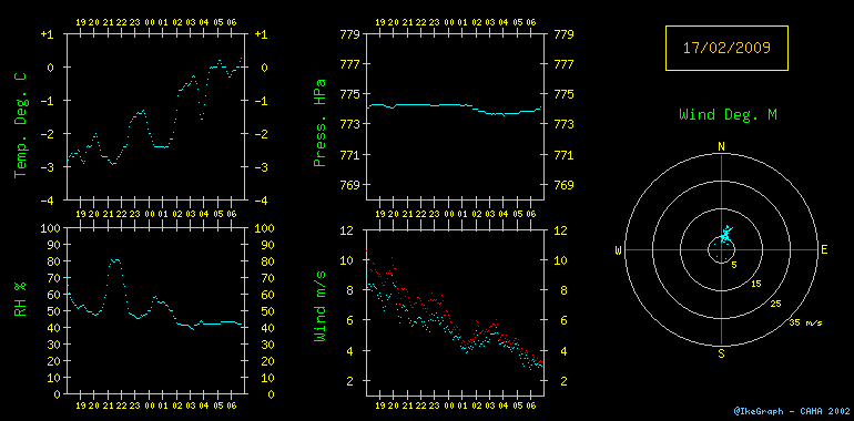 Toujours installés en fin d'après midi près de la carrière désaffectée, à 4km avant l'observatoire 37°14'37.57"N , 2°31'1.58"O 1850m d'altitude au nord de l'observatoire bien visible plein sud, car il y avait trop de vent à l'observatoire . Toutefois nous aurions du rester à l'observatoire, car les relevés météo montrent que le vent c'est bien calmé dans la soirée, (ci dessous au milieu en bas) 30km/en fin d'après midi 15km/h à partir de 22h ceci dit un vent léger avec une tempé aux alentour de zéro cela refroidit déjà pas mal et il était difficile de le savoir à l'avance d'autant que nous n'avions pas accès à l'nternet...