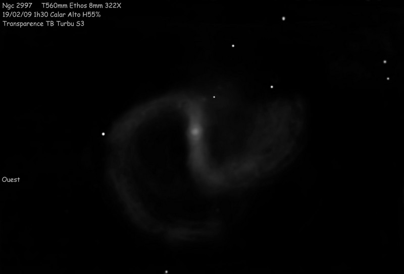 *M97 très belle à 322x * étoile centrale visible en permanence en VD, les deux "yeux" bien net aussi , d'autres zones sombres apparaissent ainsi que deux étoiles sur la nébuleuse du même coté (mag 17.4) et peut être très faiblement une troisième à l'opposé de la centrale sans doute pas loin de mag 18?