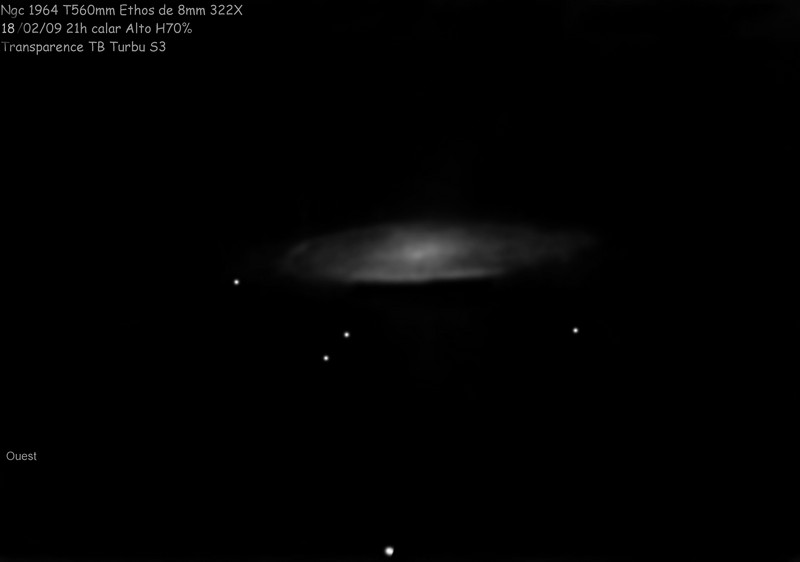 *Ngc 2613 dans la boussole , allongée vue de 3/4 presque sur la tranche, noyau de taille moyenne dégradé régulier centre bord, la moitié du chanp à 322X 3 ou 4 étoiles sur la galaxies